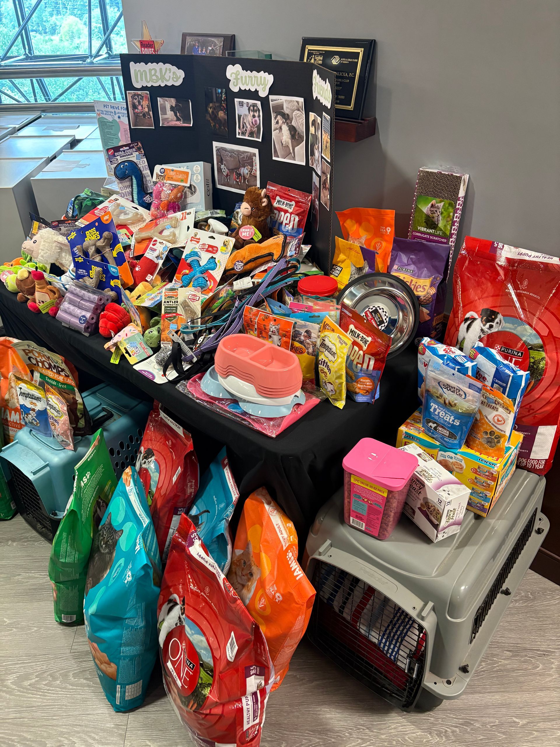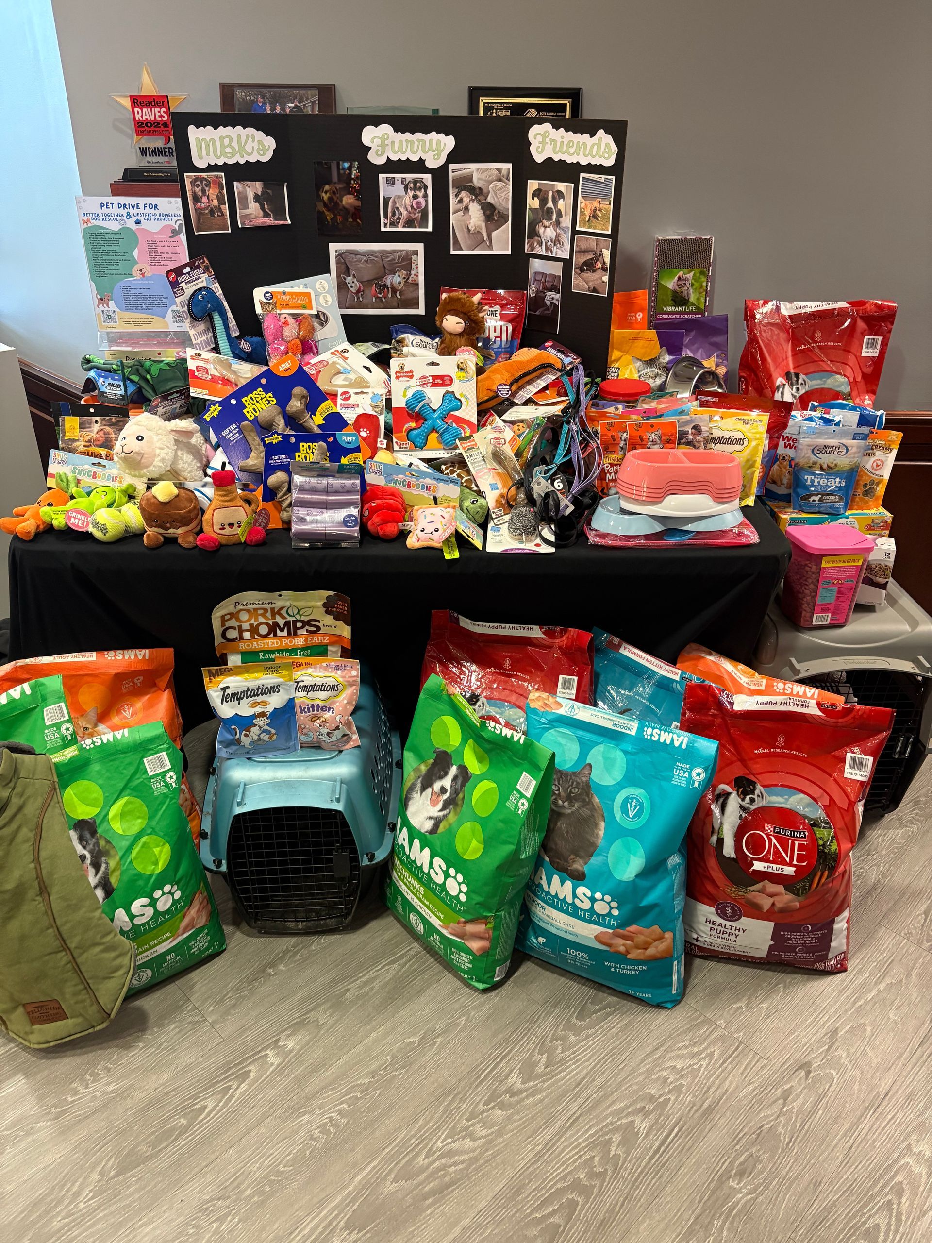 For the month of May, Francine Murphy and Caitlin Humphrey held a pet drive to benefit Better Together Dog Rescue located in Leverett, MA and Westfield Homeless Cat Project located in Westfield, MA. Working together and with firm-wide support, we were able to deliver over a thousand dollars of food, toys, treats, towels, carriers, leashes, and other supplies for dogs and cats to each organization. The table was filled with donations!